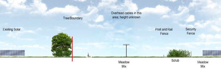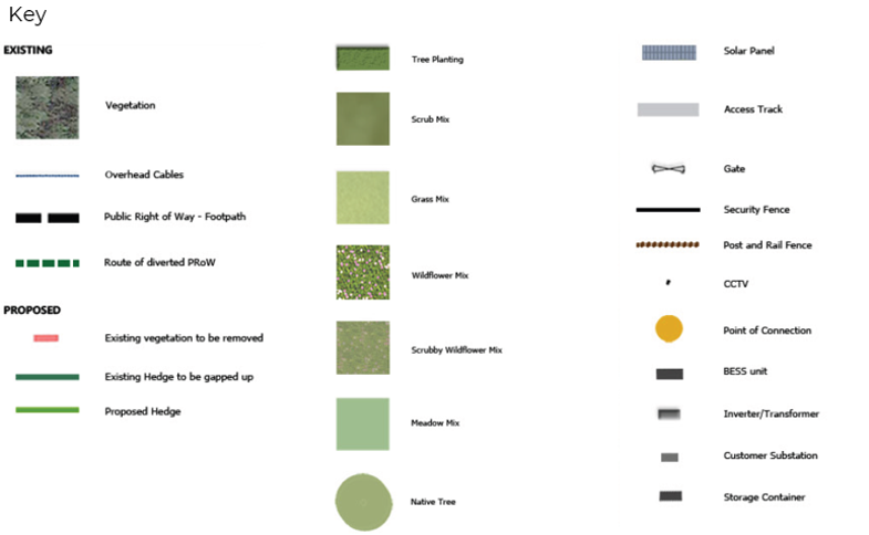 - The development would consist of static rows of photovoltaic (PV) solar panels fixed onto a metal framework supported by either single or double mounted posts, together with supporting infrastructure, including battery energy storage system units, inverters and transformers (to be housed in cabinets), a customer substation, and a storage container, access, boundary fencing and new landscaping.
