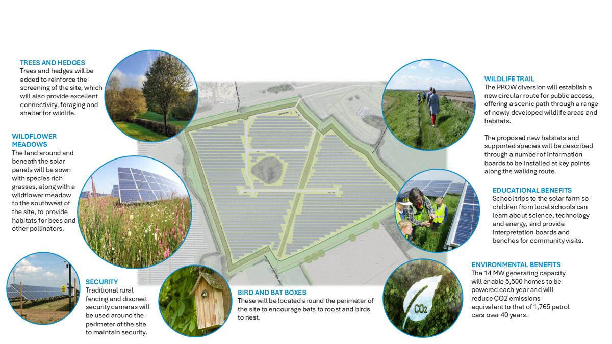 The transition to a low carbon energy system is necessary to avoid the catastrophic effects of climate change. The UK’s legal climate change commitment requires achieving net-zero greenhouse gas emissions by 2050 and more renewable energy generation is needed to meet this target. Solar farms offer a low cost and safe form of renewable energy generation. Solar powered electricity reduces the levels of carbon dioxide that are being emitted into the atmosphere by replacing the demand on electricity generation from fossil fuels. The temporary ‘rewilding’ of the land, through the provision of species rich grassland beneath and around the panels within a solar farm and the delivery of new boundary landscaping, results in considerable increases in biodiversity and provides new habitats for wildlife. It also allows the land to rest, which can improve the quality of the soil.